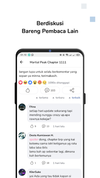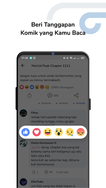 また、章ごとにコメントを書いたり、他のユーザーとコミュニケーションを取ったりすることができます。感情を表現するための便利なリアクション機能もあります。さらに、ライトまたはダークテーマを切り替えたり、コレクションを表示したり、閲覧履歴を閲覧したりすることができます。外出先でコミックやマンガを読む方には、AndroidデバイスにKomikuをダウンロードすることをお勧めします。
